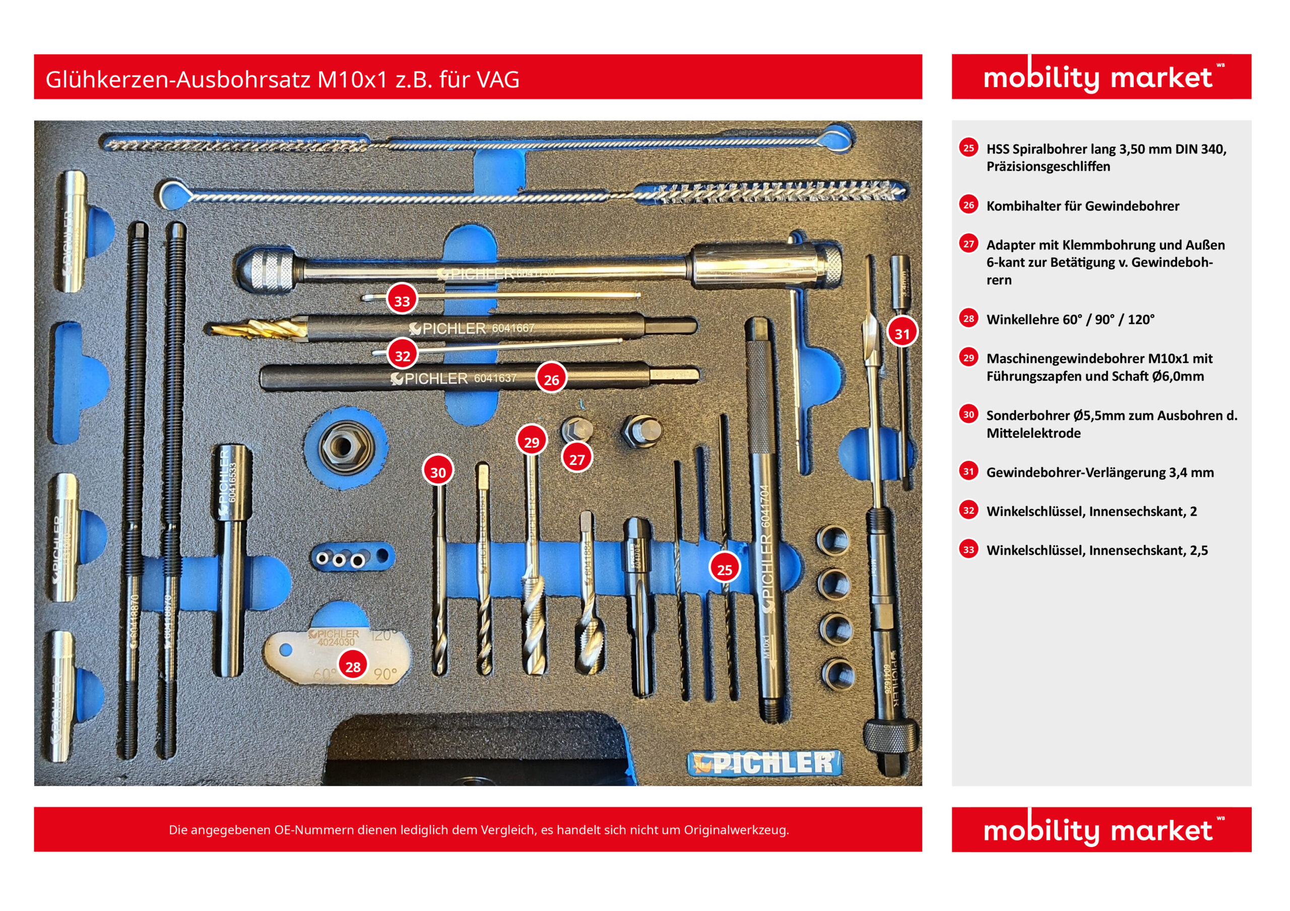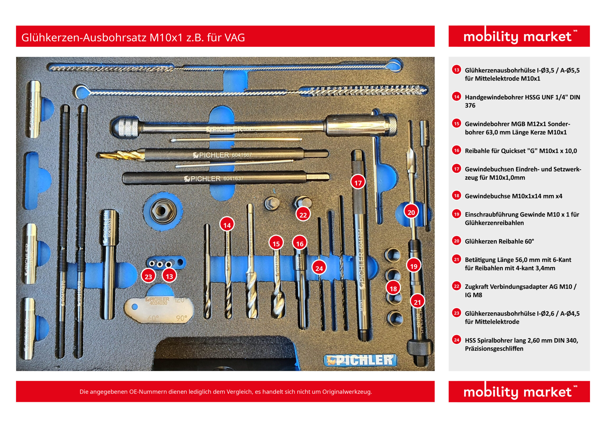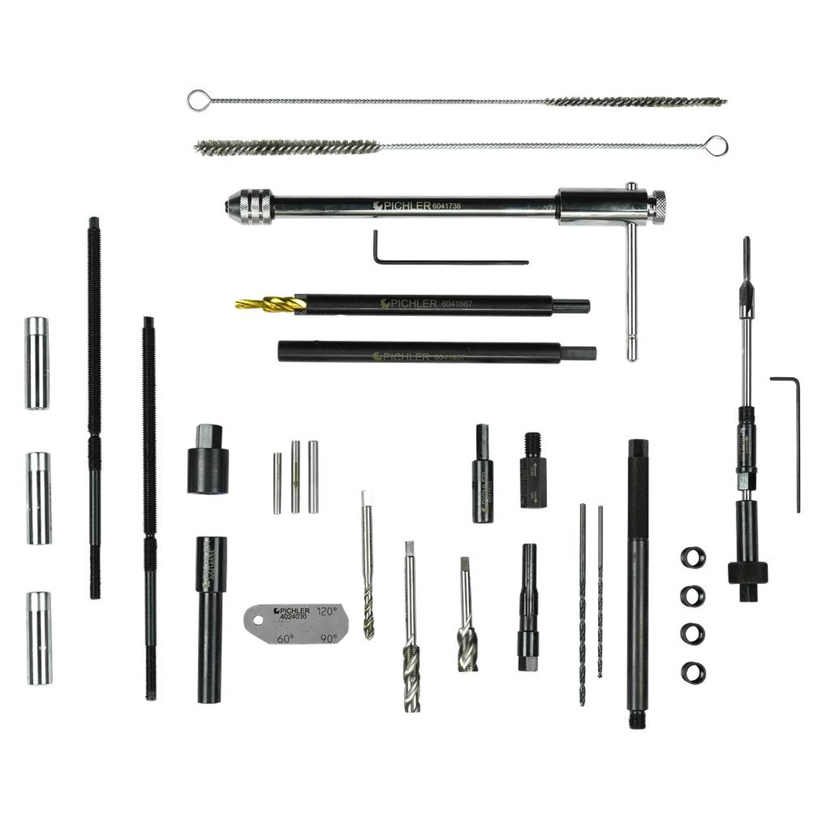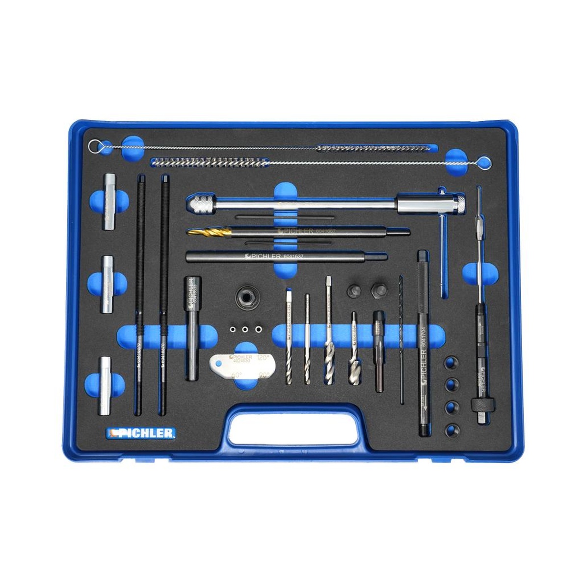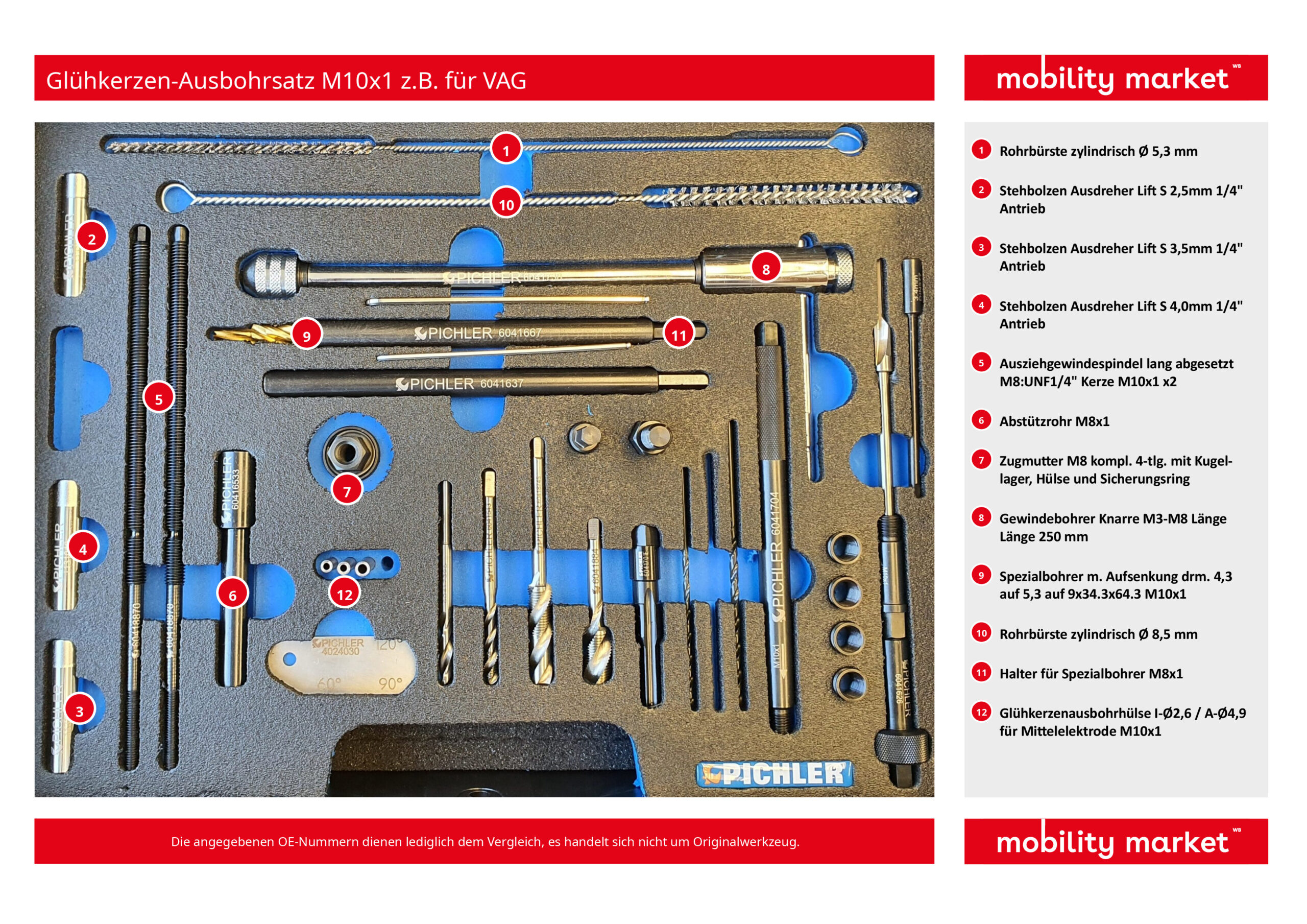 Der Pichler-Glühkerzen-Ausbohrsatz M10x1 z. B. für VAG ist für das fachgerechte Entfernen defekter Glühkerzen mit abgerissenem Sechskant ausgelegt. Gerade bei vielen VAG-Motoren sitzen die Glühkerzen tief in einem engen Schacht im Zylinderkopf, sodass für die einzelnen Arbeitsschritte besonders lange und passgenaue Werkzeuge benötigt werden. Dieser Satz unterstützt ein sauberes Ausbohren und Ausziehen der beschädigten Glühkerze sowie die anschließende Instandsetzung des Glühkerzenschachts.