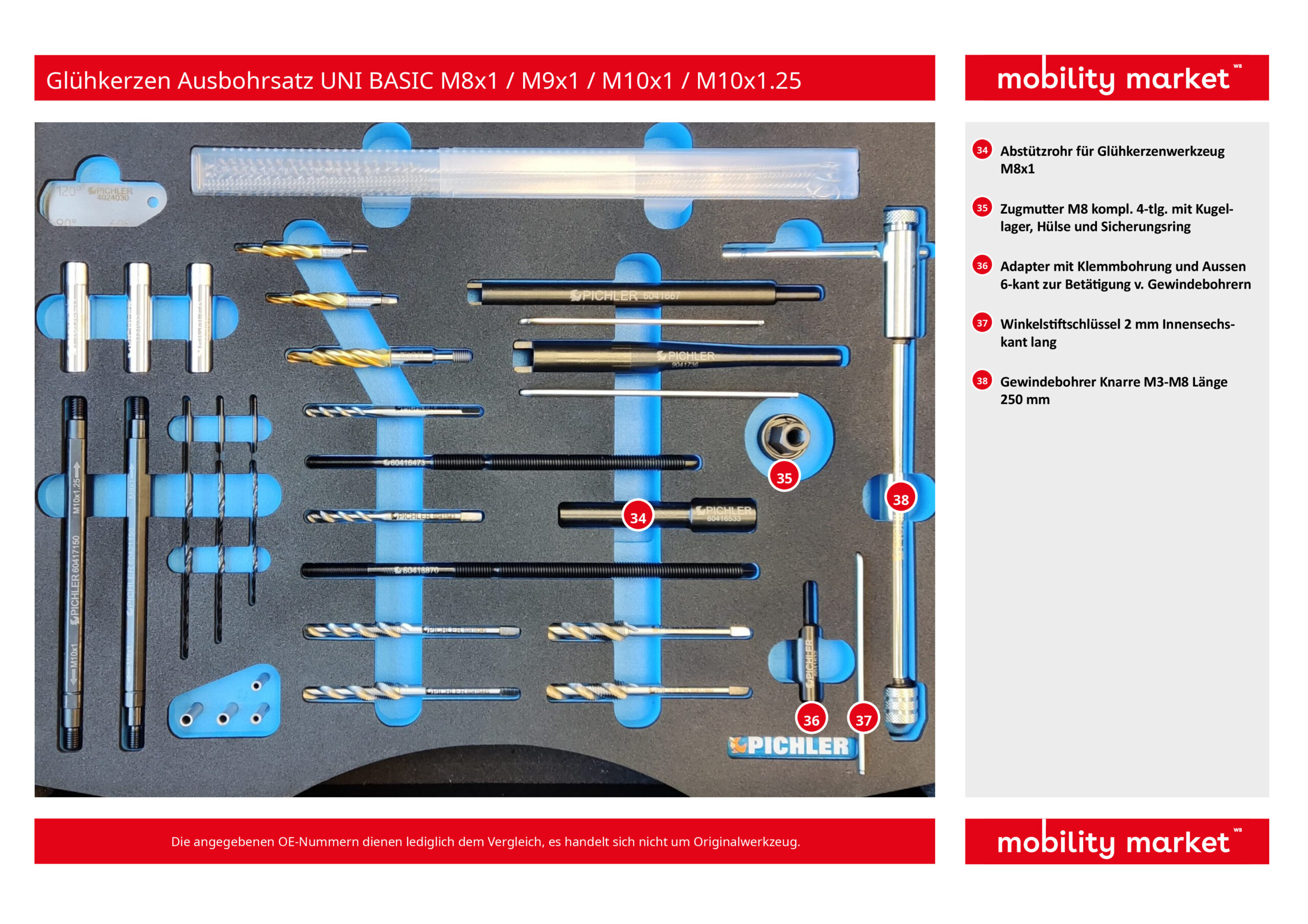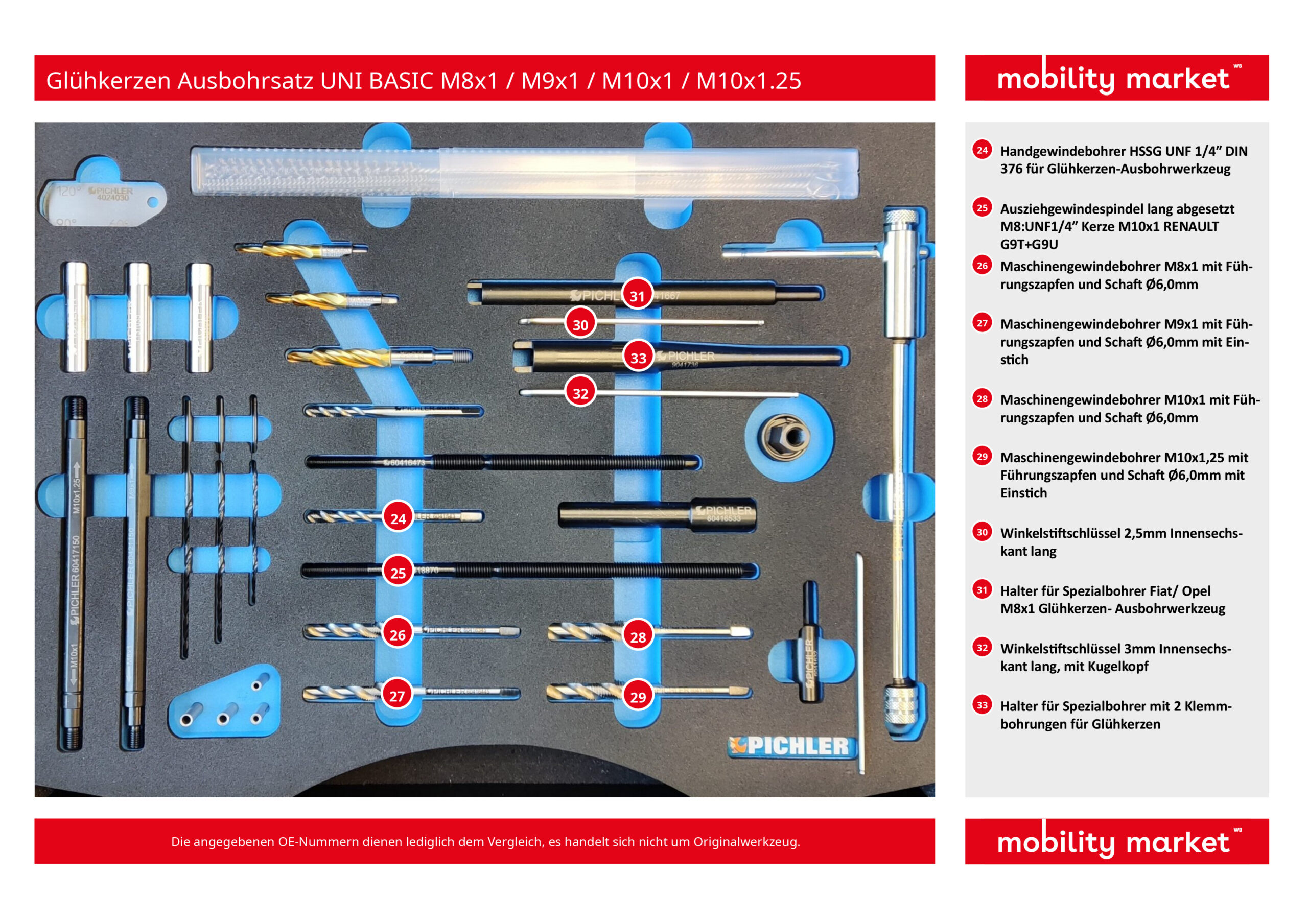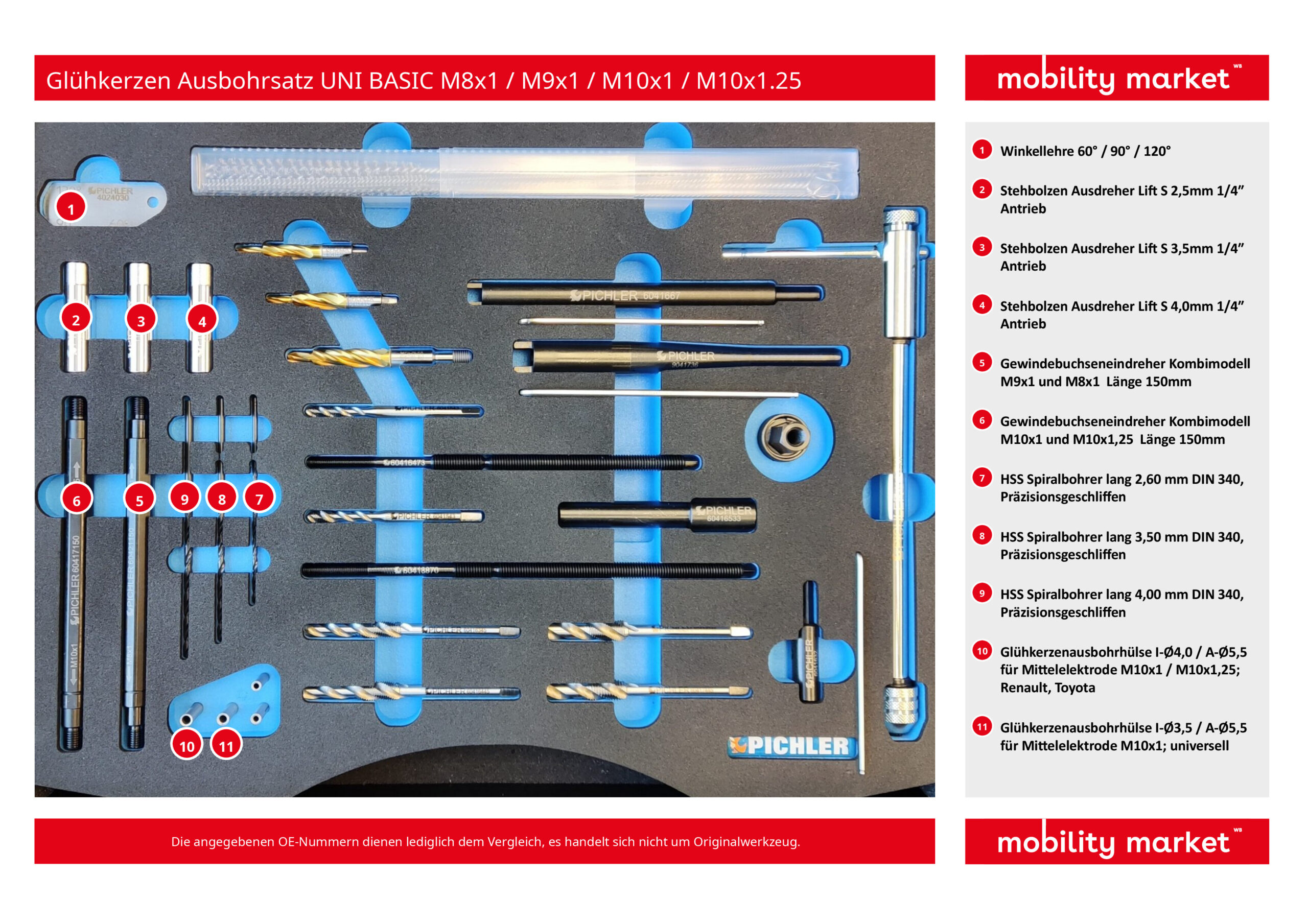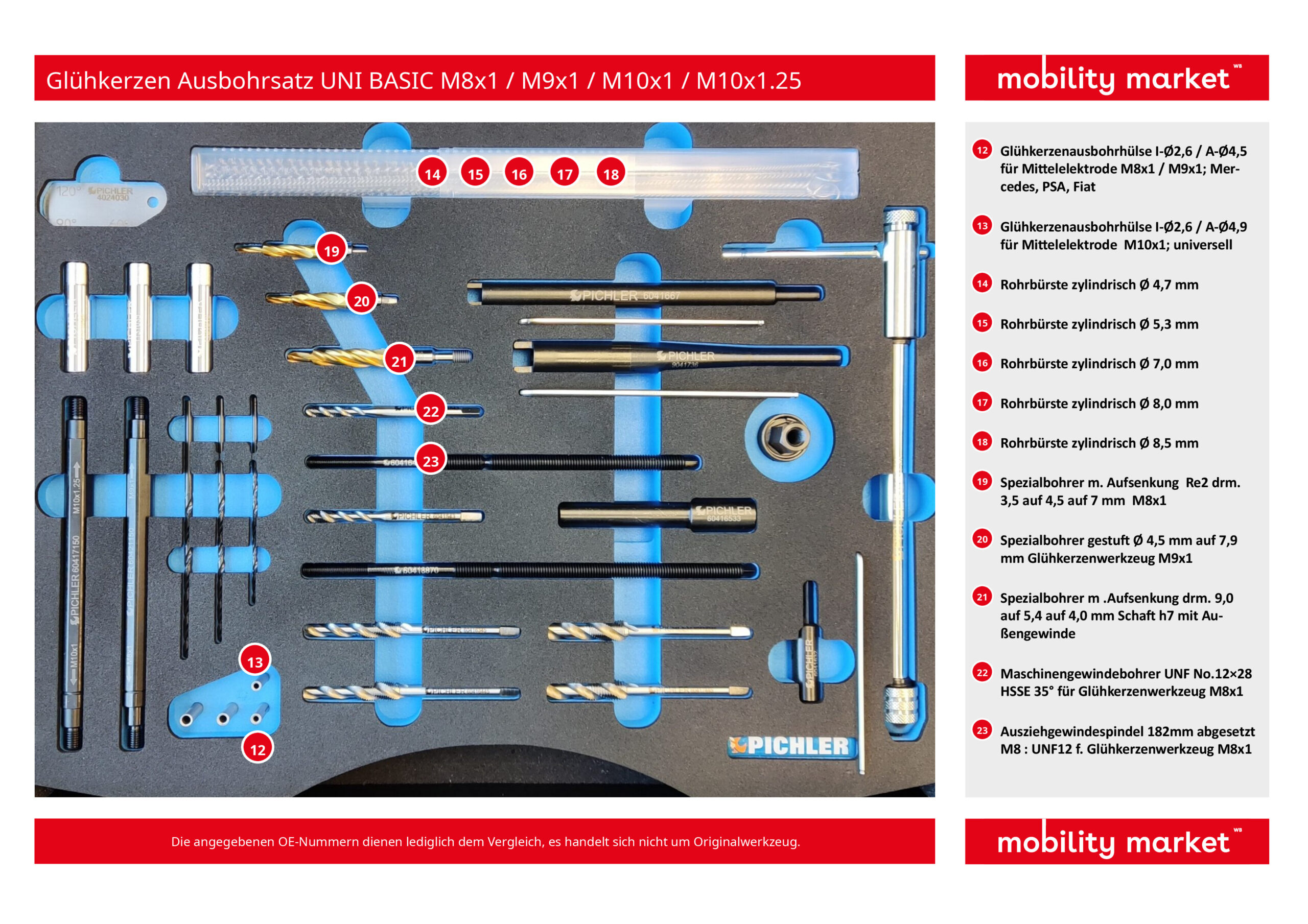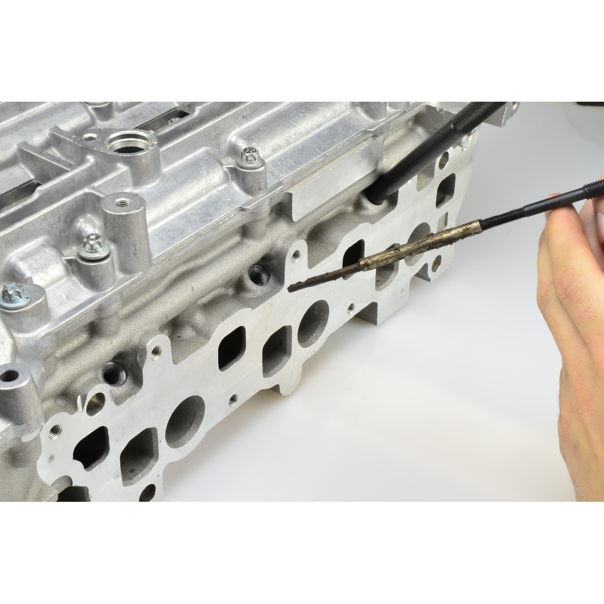 Der Ausbohrsatz ist für die gängigen Größen M8x1, M9x1, M10x1 und M10x1,25 ausgelegt und eignet sich damit für viele Anwendungen im Werkstattalltag. Bei Bedarf kann der Dichtsitz der Glühkerze mit optional erhältlichen Spezialreibahlen nachgearbeitet werden.